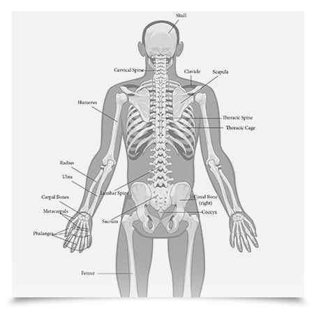 A detailed reference of the Posterior Skeleton outlining all major bones and groups.